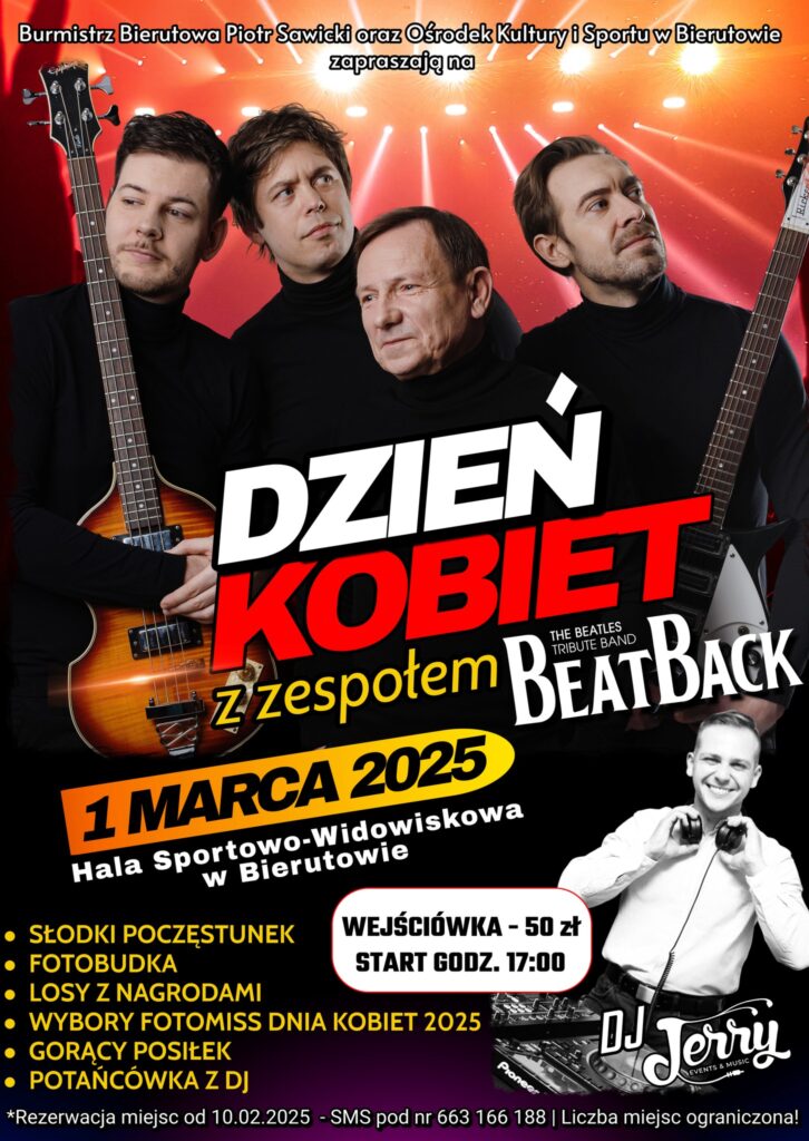 Już w najbliższą sobotę, 1 marca o godz. 17:00 w Hali Sportowo-Widowiskowej, Ośrodek Kultury i Sportu w Bierutowie zaprasza na wyjątkowy wieczór pełen muzyki, zabawy i niespodzianek! Dzień Kobiet z zespołem Beat Back – polscy Beatlesi